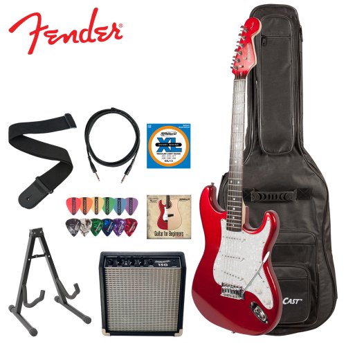 - Everything you need to start rocking, including a candy apple red Stratocaster guitar and 10-watt Squier amp with 10-foot cord